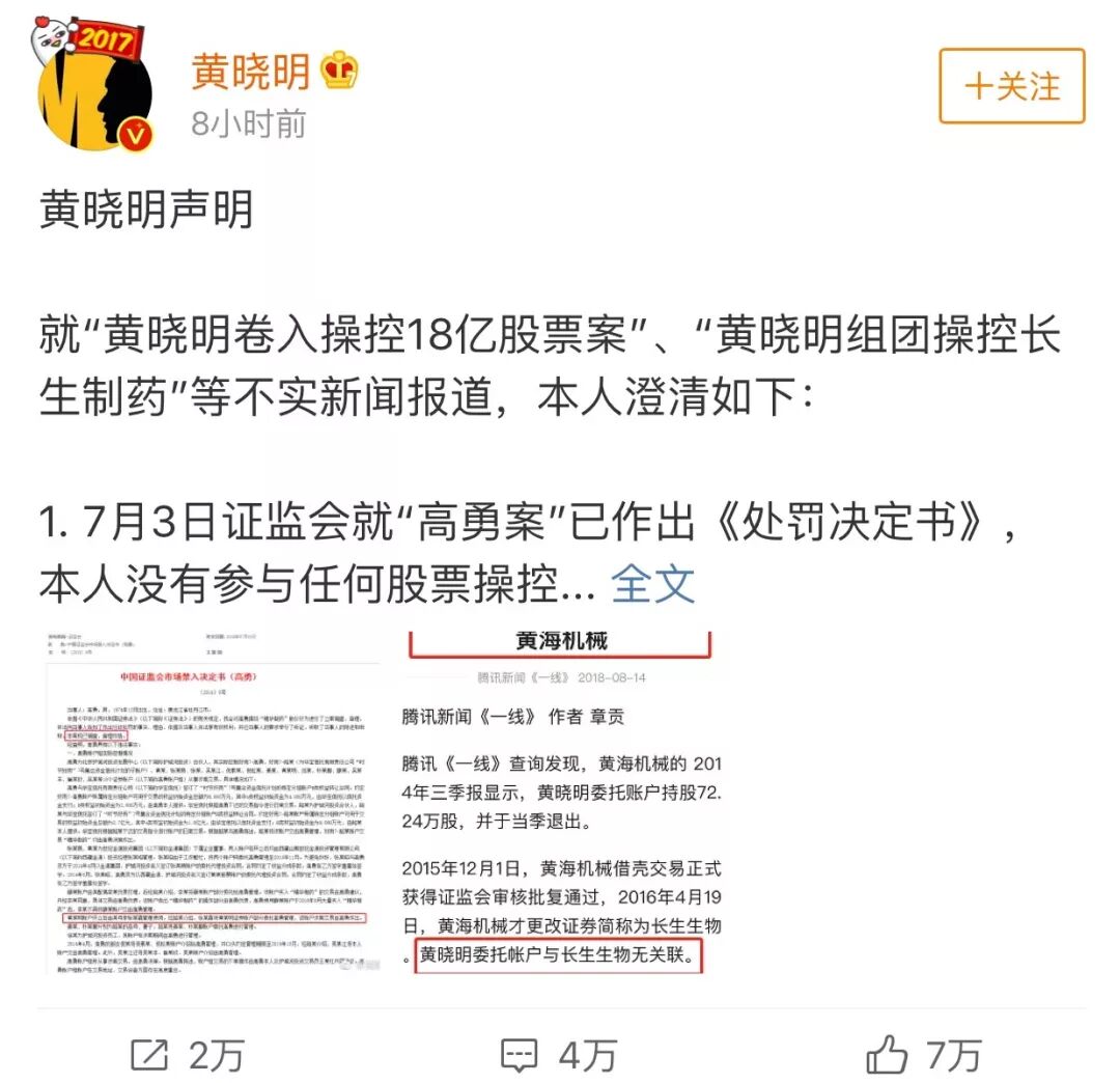 8月15日凌晨,黄晓明通过官方微博发布声明称,7月3日证监会就“高勇案”已作出《处罚决定书》,他本人没有参与任何股票操控。他再次强调,本人不认识高勇,只是委托路某理财。他本人从未参与过“长生生物”股票投资。