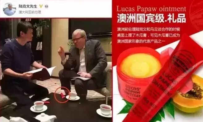 澳洲前总理陆克文和马云谈合作的时候,桌面上摆了木瓜膏,可见木瓜膏已成为澳洲国家形象的代表产品之一!