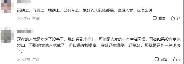 有网友认为,飞机是公共交通工具,但在公共场合脱鞋仍然缺乏公共礼仪和文明素养。