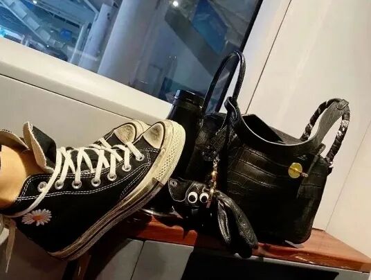 在飞机上,她脱下鞋子,光脚蜷缩在座位上,一双黑色高跟鞋放在座位下。