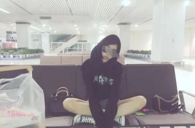 照片中的娜扎盘腿坐在候车厅的凳子上,鞋底并未接触座椅。
