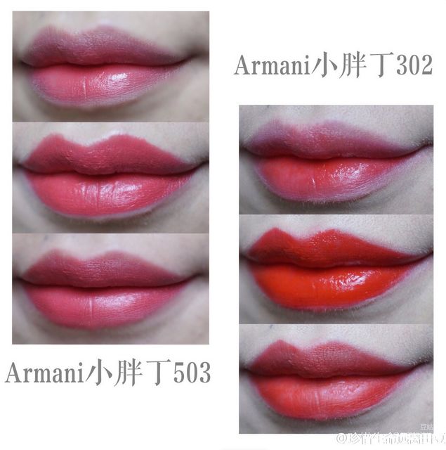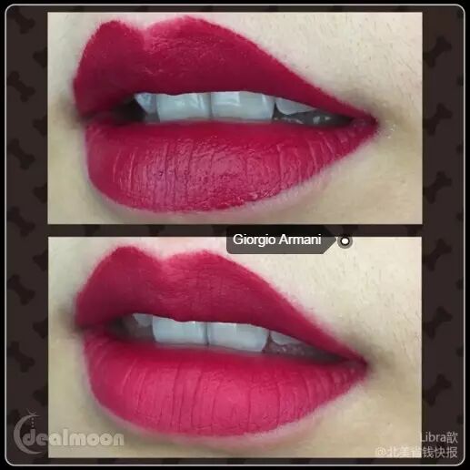 晒货粉丝@Libra歆:阿玛尼红管唇釉502,很美的蓝调红,试色图上面是直接抹的颜色,下面是用纸巾抿过后的颜色;最后是红管唇釉504,玫瑰色超美的,不过自己抿嘴的时候不小心出界了好丑