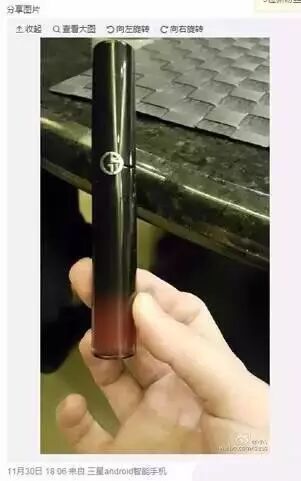 之后,贴心的她马上在微博上公布了品牌的名字,不出意外,就是彩妆界的大户阿玛尼!不过她狡猾地没公布色号啊,网友们猜测看样子像是阿玛尼漆光迷情唇釉的201号,复古又性感。