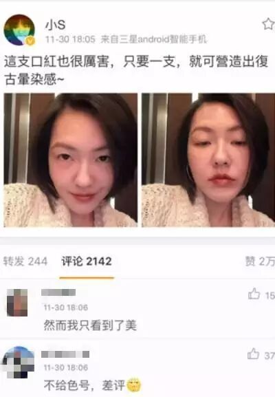 小s曾经先是在微博上发文:“这支口红很厉害,只要一支,就能营造出复古晕染感。”再附上眼神迷离的自拍图,成功吊起了大家的胃口。