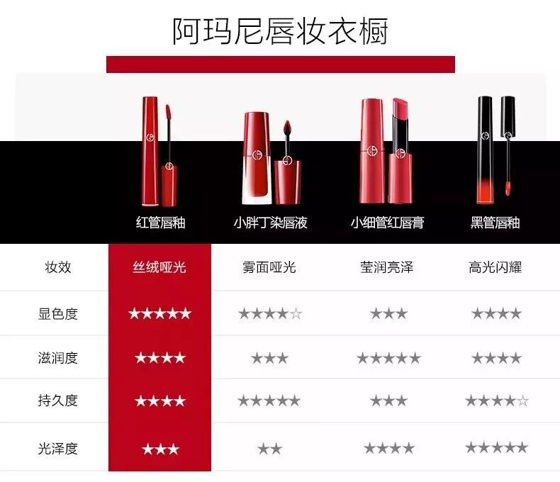 小编自从入了美妆圈以来,也一直是阿玛尼唇釉的忠实拥护者。但是面对她们家各式各样的唇釉和色号分类,总是有点晕。与小编有同样苦恼的小伙伴,今天咱们就来仔细研究一下阿玛尼家的唇妆衣橱!上一张清晰的对比图!
