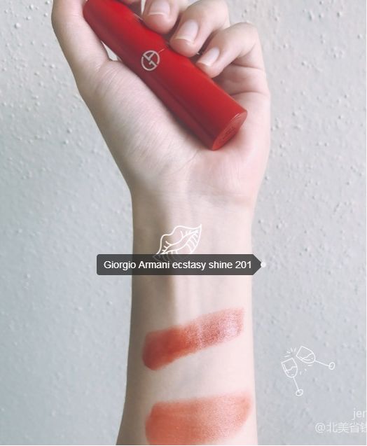 晒货粉丝jenny77:今年必入款!最近素颜神器——阿玛尼新款Ecstasy Shine系列最火的201烂番茄色,超级显唇红齿白!真的是润到一个不行,偷懒不想化妆出门的时候就涂它,完全没有违和感还无敌显脸白牙白。而且完完全全不挑皮