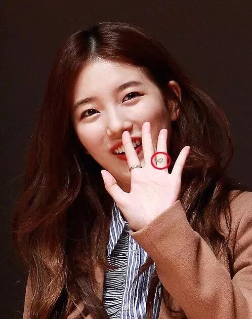 当天秀智身穿棕色西服长外套,内穿蓝白条衬衫,下面是紧身牛仔裤,展示了秋日时尚。尤其,秀智以她一贯的灿烂笑容,向大家摆手问好中,发现左手无名指上有一个心形纹身,引人注意。