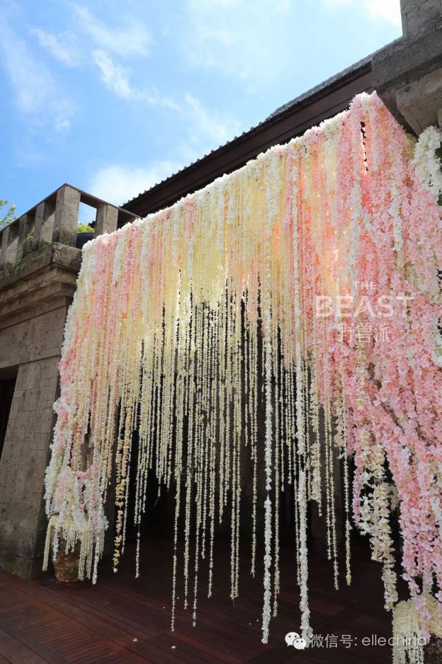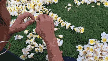 ▲ 现场长达5000米的花串是由巴厘岛当地的妇女用一朵朵鸡蛋花串成的。