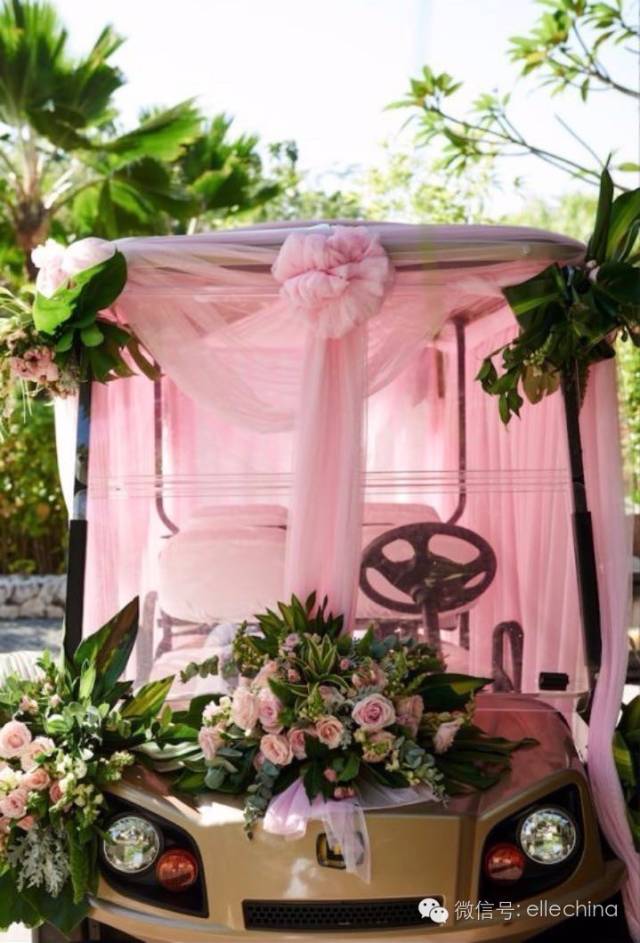 ▲ 婚礼现场用于接送新人的花车也被蒙上了粉嫩嫩的纱,着实萌萌哒。