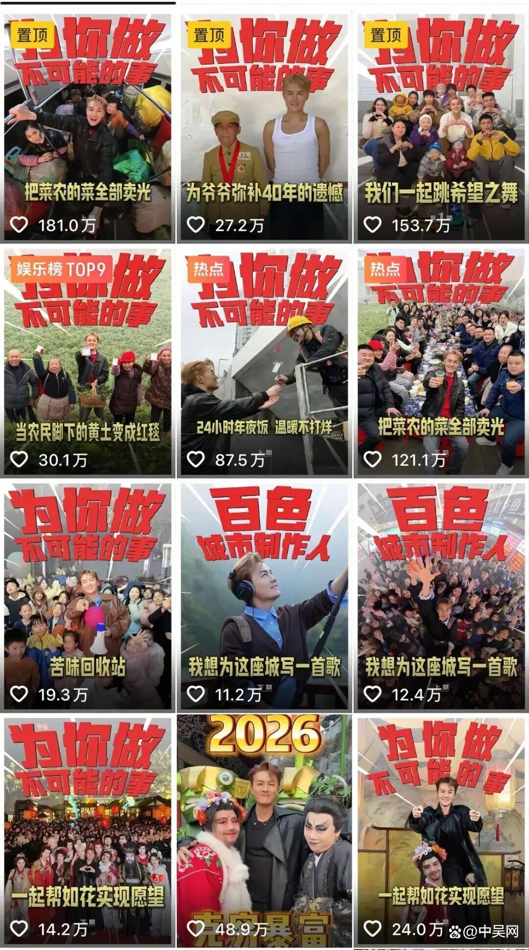 与常规的发行新专辑、开演唱会等方式制造热度不同,吴克群在贵阳谷定村的田埂上主持了一场朴实的蔬菜拍卖会。一小时3万斤蔬菜售罄,40余家本地商超签下长期收购协议,让上年纪的菜农不用再背着沉重的菜篓挤惠农公交进城叫卖;他为呼和浩特市一家承载着几十位特殊人群就业希望的爱心饭店垫付了8万多元的房租,保住了他们的“饭碗”……