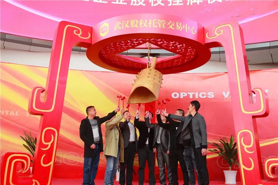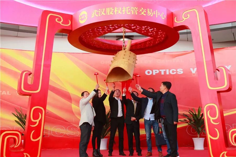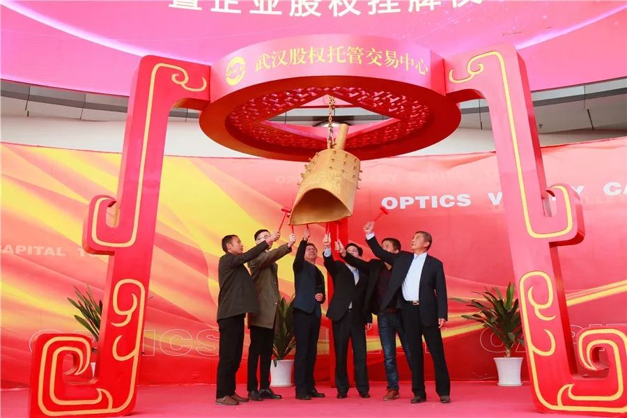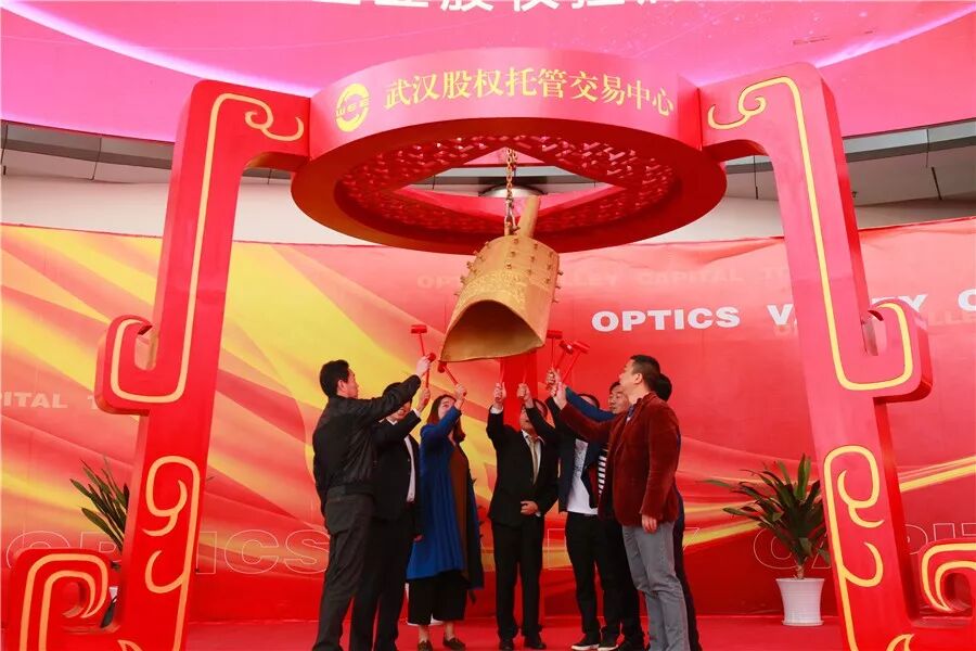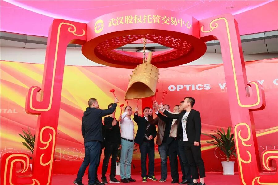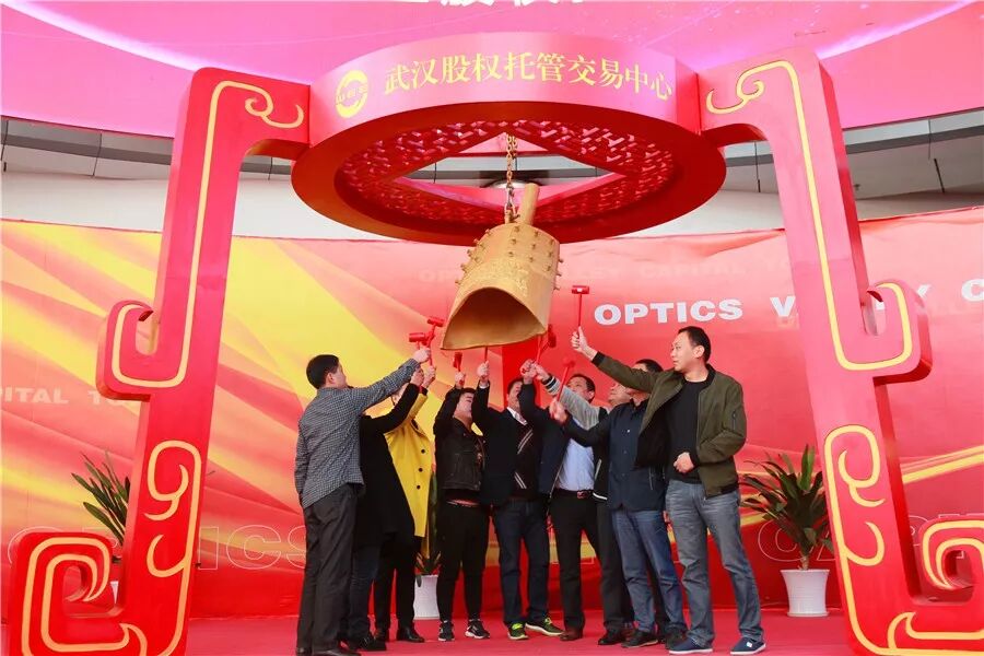荆州开发区管委会副主任陈明宇与“华屹建材”、“精盛机械”、“荆州恒宇”、“先博智能”、“宜发节能”、“万光包装”、“爱婴贝比”等企业代表一起上台,为企业股权挂牌鸣钟开市