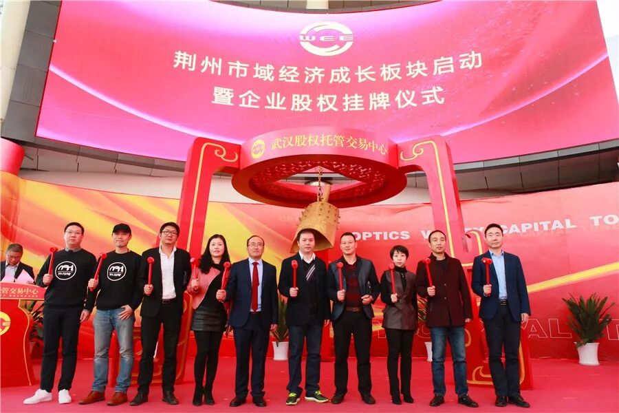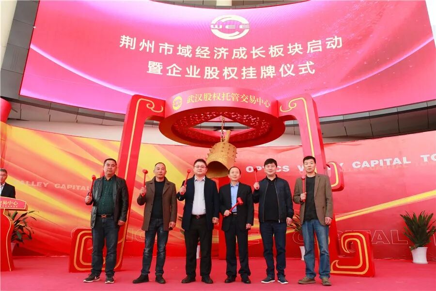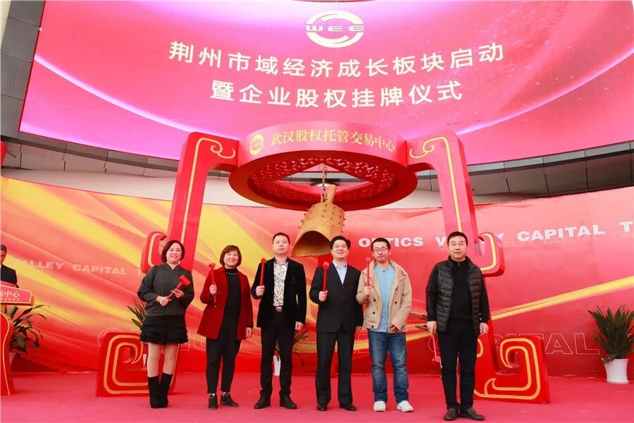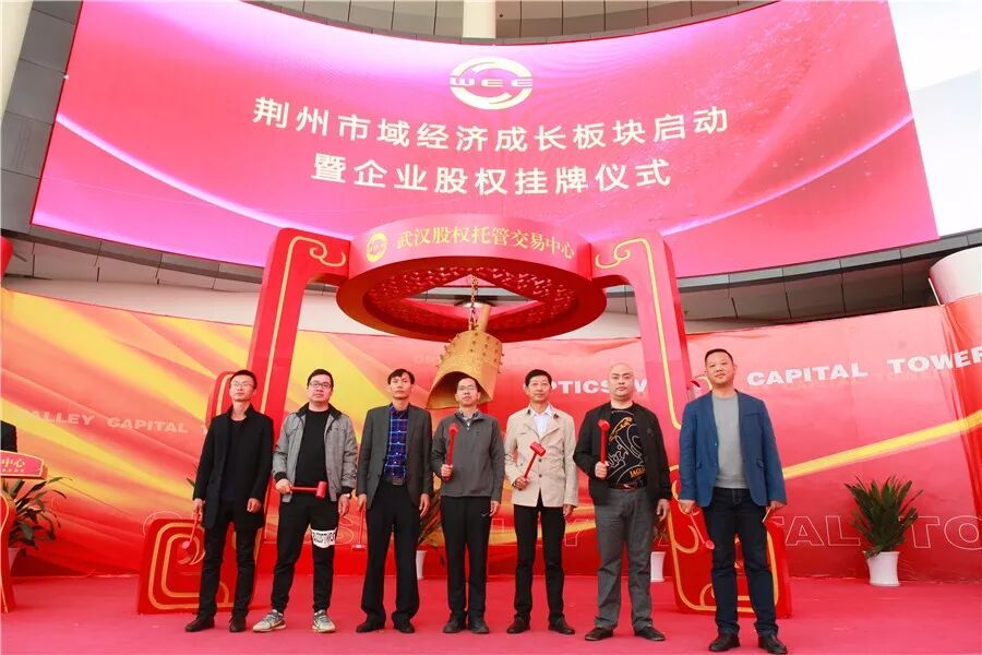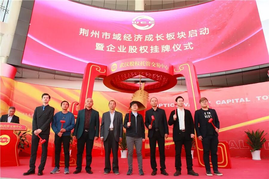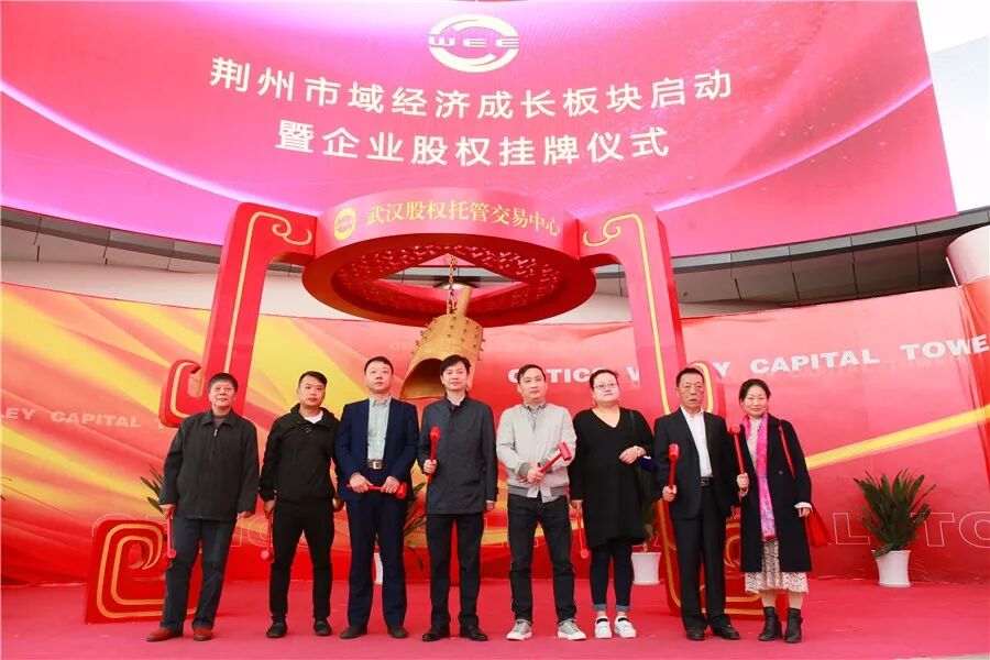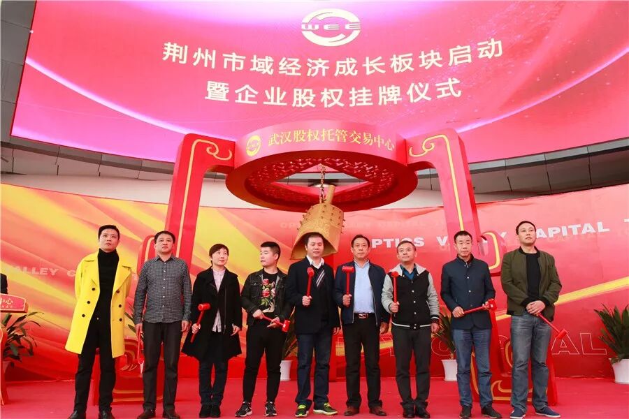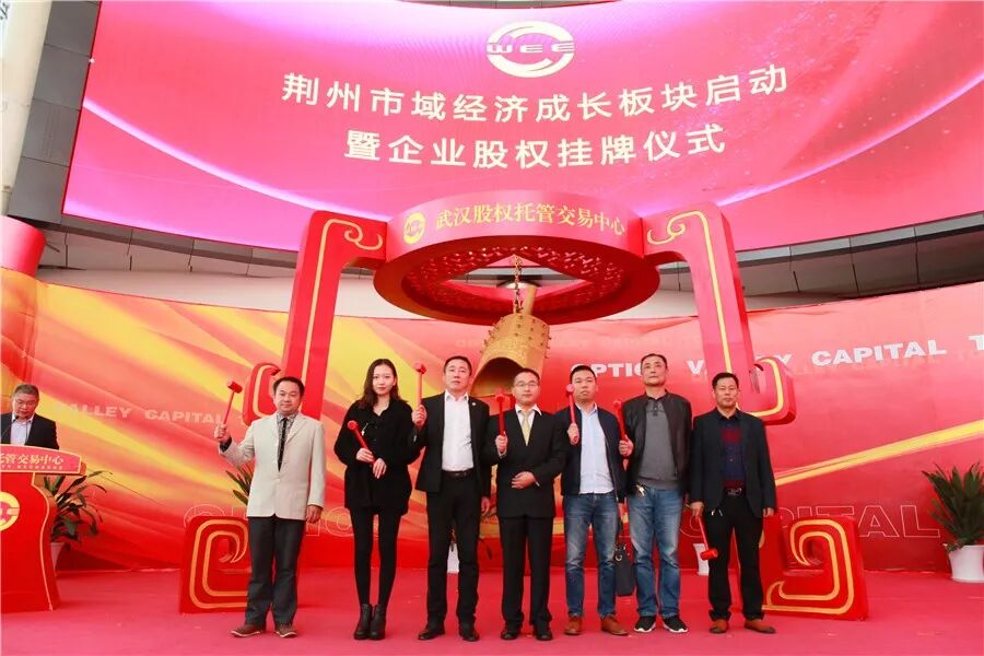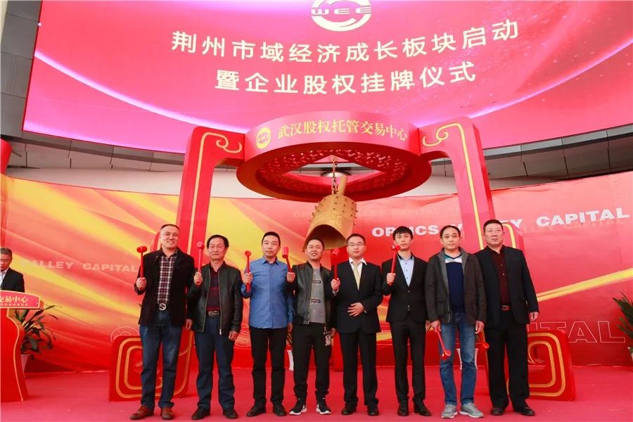 荆州区委常委魏冬与“旭日东升”、“美泰橡塑”、“艾士涂料”、“长大颐腾”、“春丽环保”、“兴合包装”、“富阳米业”等企业代表一起上台,为企业股权挂牌鸣钟开市