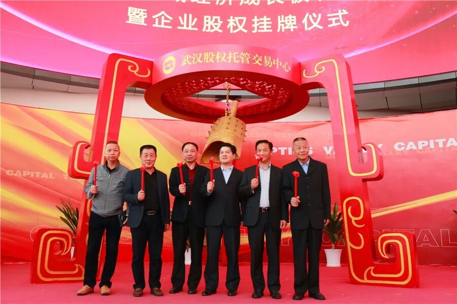 洪湖市副市长夏玉强与“老曹家”、“焕祥水产”、“团结米业”、“鑫隆水产”、“翔翔木业”、“脆脆香”等企业代表一起上台,为企业股权挂牌鸣钟开市