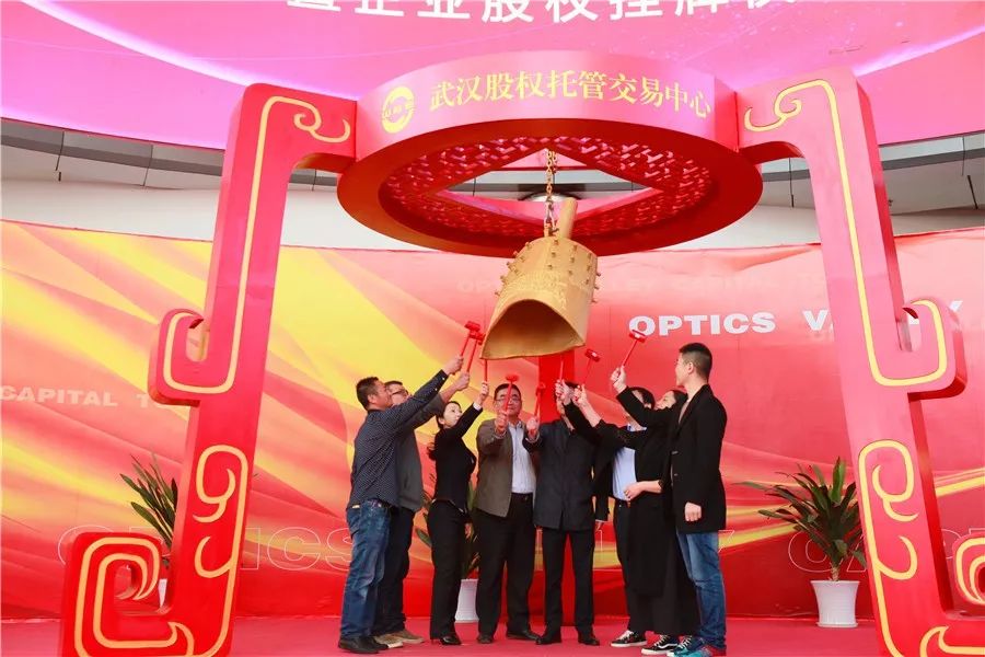 洪湖市副市长夏玉强与“万佳石化”、“八卦洲”、“天工金属”、“云雾湖”、“洪星达”等企业代表一起上台,为企业股权挂牌鸣钟开市