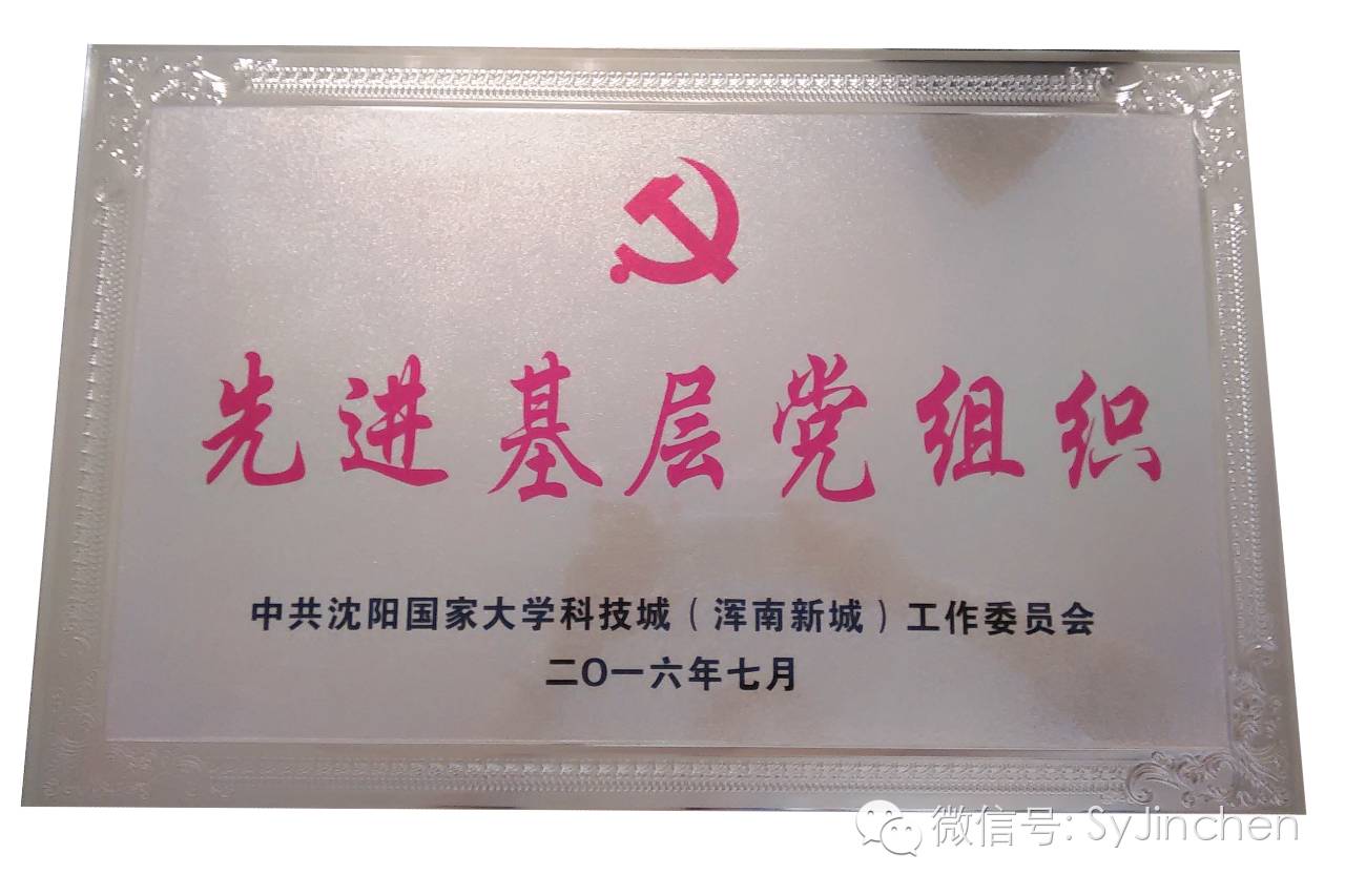 2016年7月22日在沈阳国家大学科技城浑南新城管委会的一楼礼堂里,由沈阳国家大学科技城党工委组织召开的“庆祝中国共产党成立95周年暨一先两优表彰会”上,金晨党支部书记张丹翠代表金晨党支部上台领取了“先进基层党组织”的荣誉证牌,这项荣誉的获得不仅是对金晨党支部全体党员努力工作的一个肯定,也是对党支部未来发展的一个推动,这也是金晨党支部继获得优秀党务工作者荣誉之后的又一佳誉。