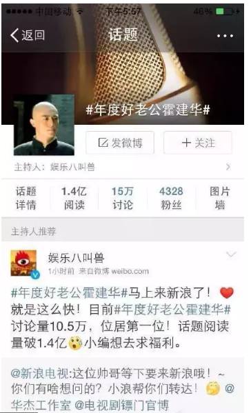 新浪微博上甚至有一个话题叫做“年度好老公霍建华”,当时的热搜甚至罕见的破了亿。甚至服务器一度瘫痪。
