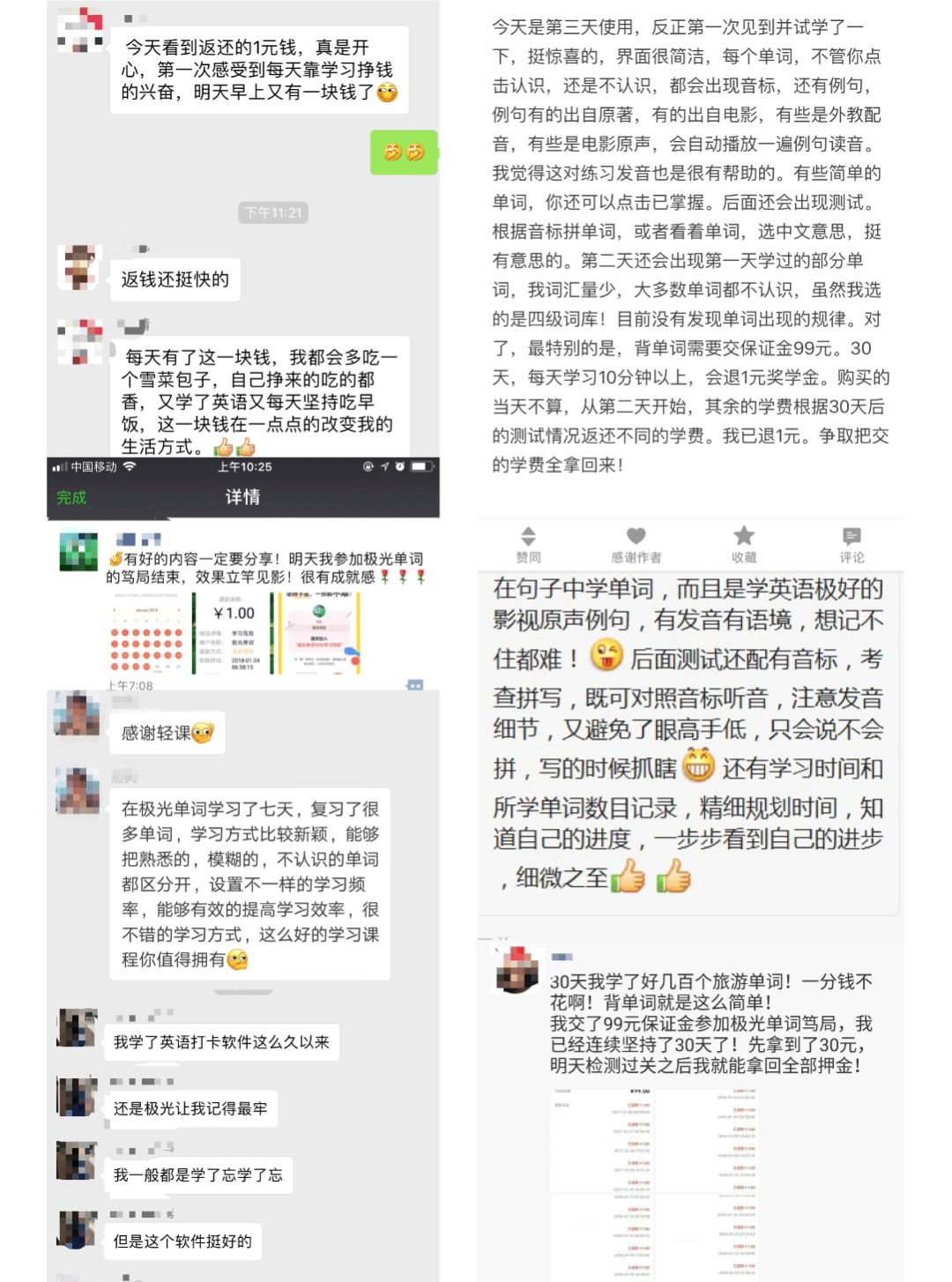 根据轻课开课经验,我们发现所有参加金钱刺激的同学,学习积极性远远高于普通学员。现在已经有90%的学员完成了学习标准,退回了学习保证金,并得到了一个英语蜕变的自己。