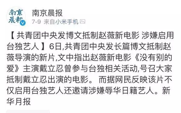 最近,赵薇的第二部电影作品因为选角问题被推上了风口浪尖,戴立忍涉及政治言论风波甚至惊动了共青团中央。
